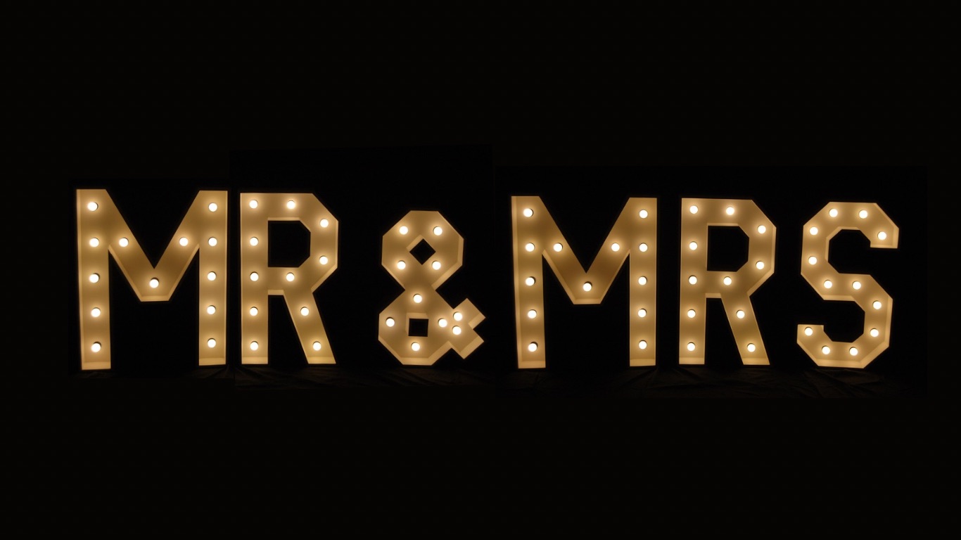 Onze MRS & MRS lichtletters maken elk trouwfeest persoonlijk en stralend — een uniek symbool van jullie liefde en trots.